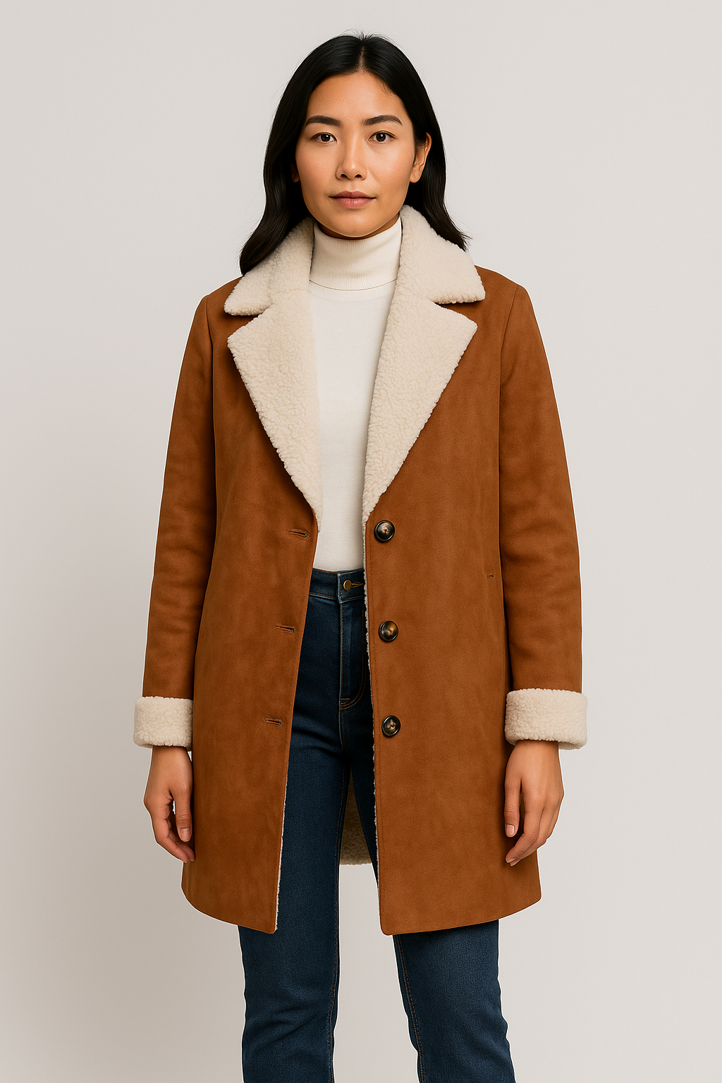 The wide lapel collar and turned-up cuffs reveal the soft faux shearling lining, adding both texture and warmth. Full-length sleeves, deep side pockets, and a classic three-button front make it both practical and versatile. Whether layered over knitwear or draped over office attire, this coat is built for day-to-night wear through the colder seasons.