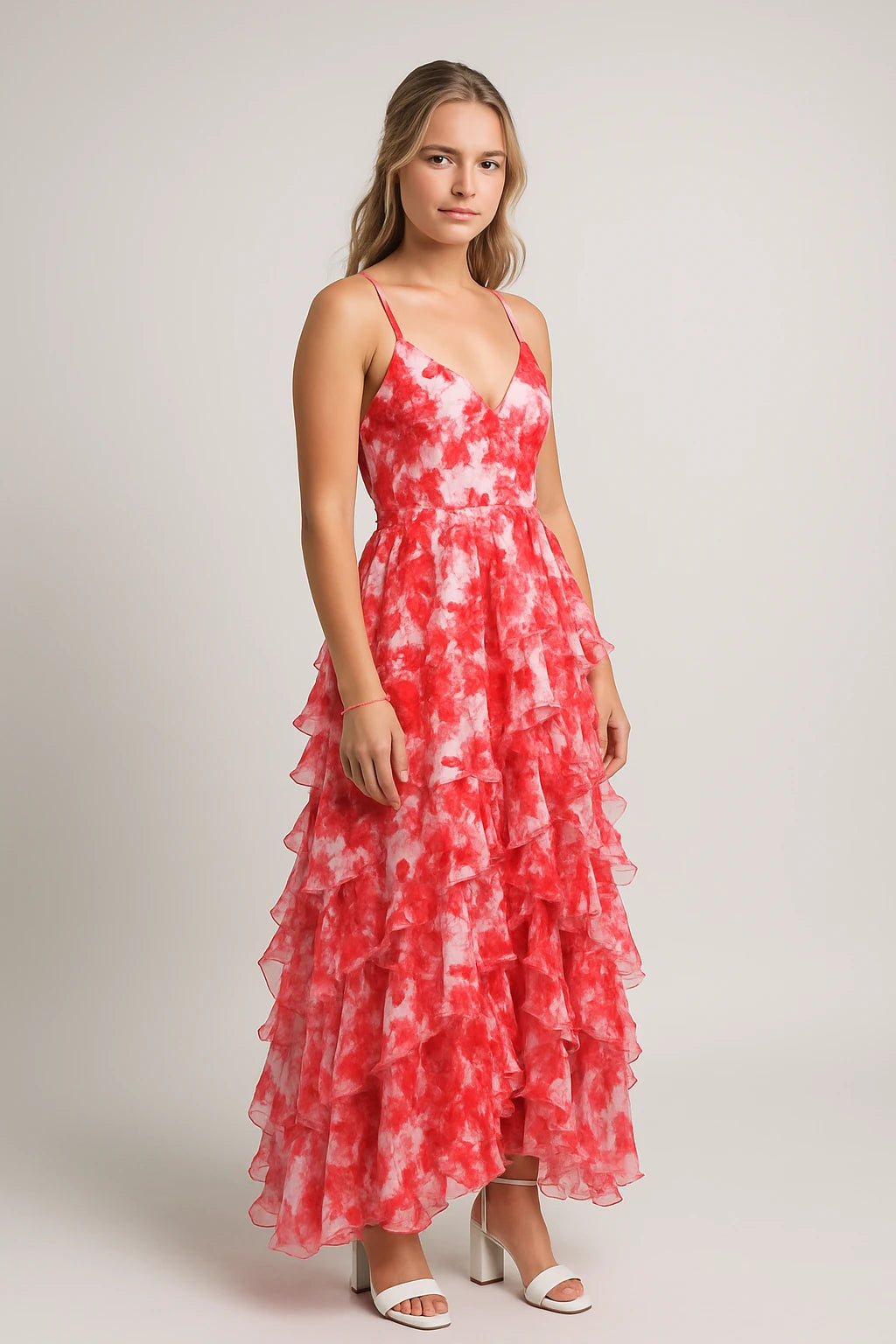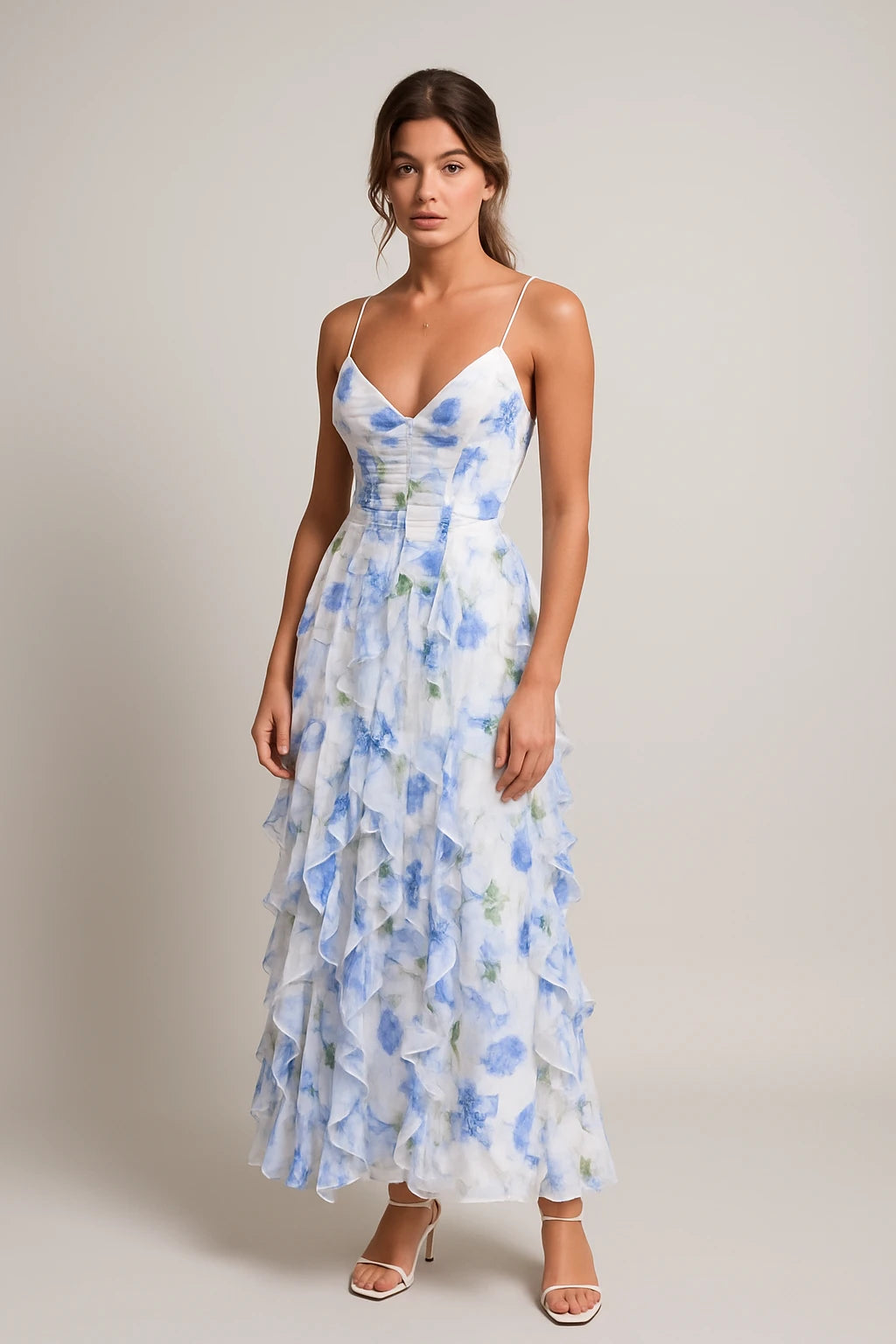 Soft, romantic, and effortlessly elegant, this floral maxi dress is designed to make a statement while keeping you cool in the summer heat. The fitted bodice features a gentle sweetheart neckline and slender spaghetti straps, complemented by a subtle cut-out detail at the back for a hint of allure. Flowing into a softly flared skirt, the lightweight fabric moves with grace, making it ideal for garden parties, holidays, or summer events.