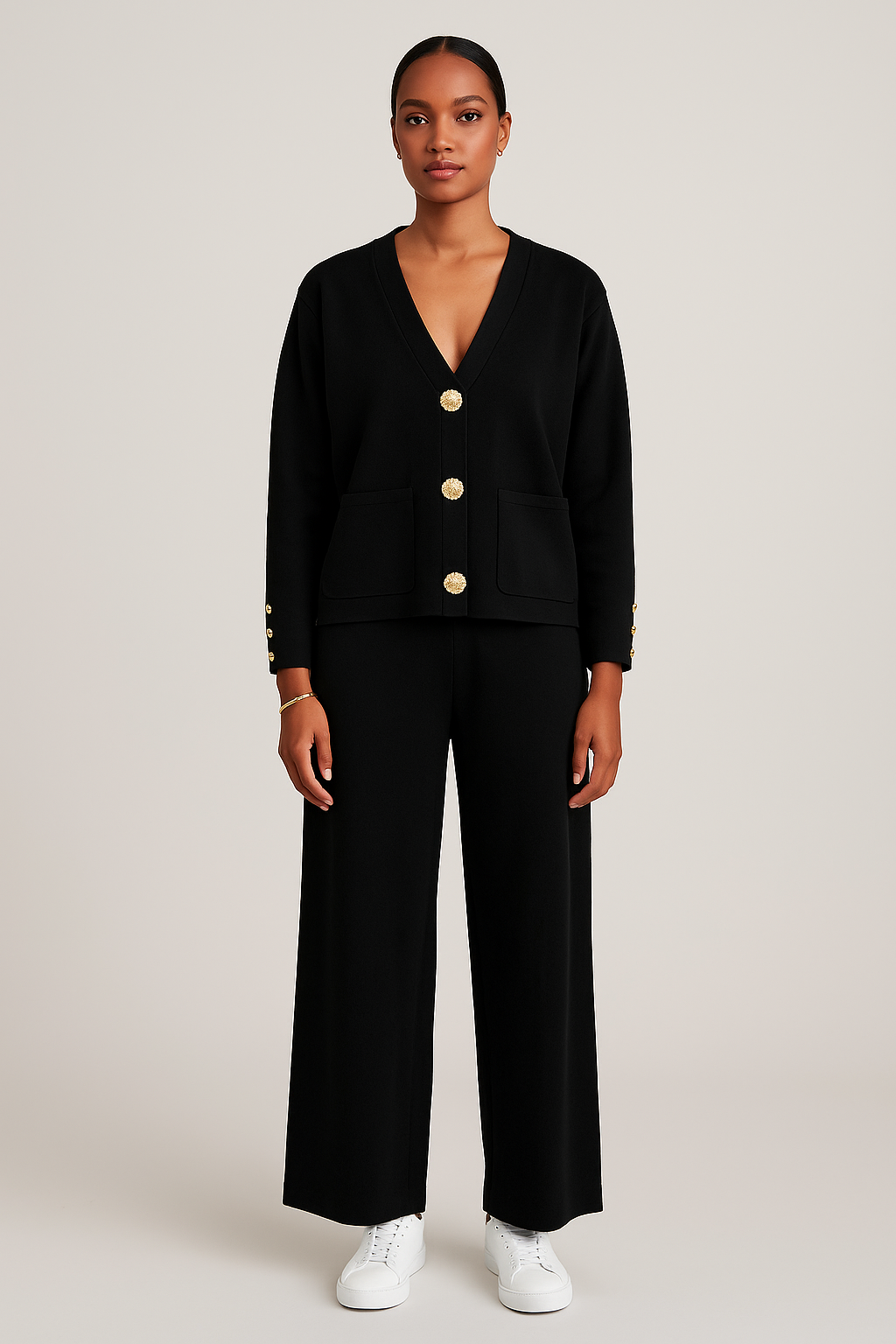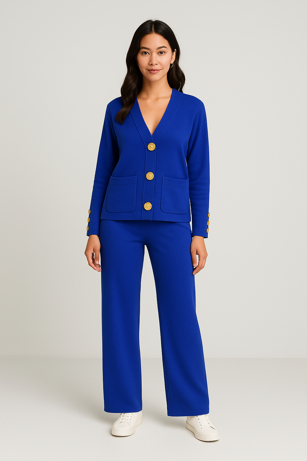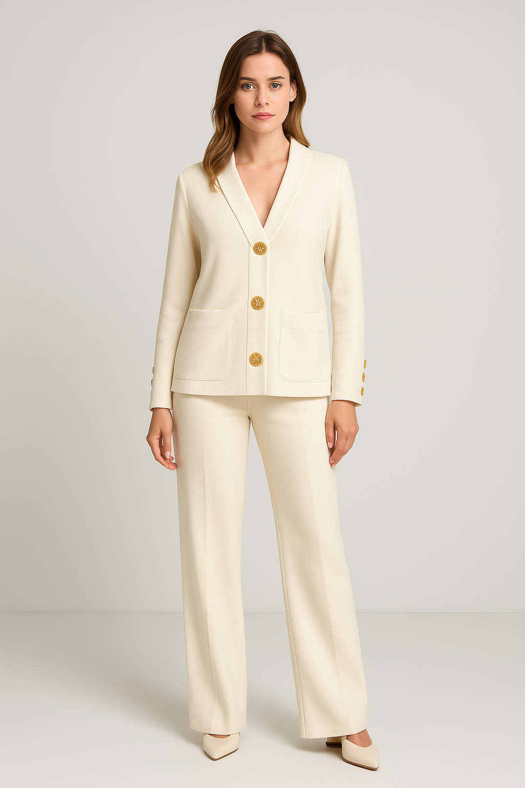 Step into confident sophistication with this tailored wide-leg blazer set — a polished co-ord crafted for modern power dressing. Featuring a structured longline blazer with a deep V-neckline and standout gold-toned buttons, the look is elevated yet wearable. The matching high-rise trousers feature a clean front and a wide-leg cut, offering elegant flow with every step.